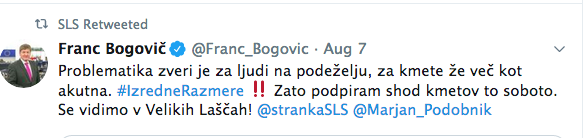 Politična kampanja SLS daje napačen vtis, da je leta 2019 največja težava kmetijstva nekaj volkov in medvedov. Smrtnost zaradi rakavih obolenj v Sloveniji je alarmantno visoka. Leta 2018 smo bili na vrhu v Evropi! Zaradi raka, ne zaradi volkov ali medvedov. Za Bogoviča so izredne razmere volkovi, ki napadejo ovce, ne pa ljudje, ki umirajo za rakom.